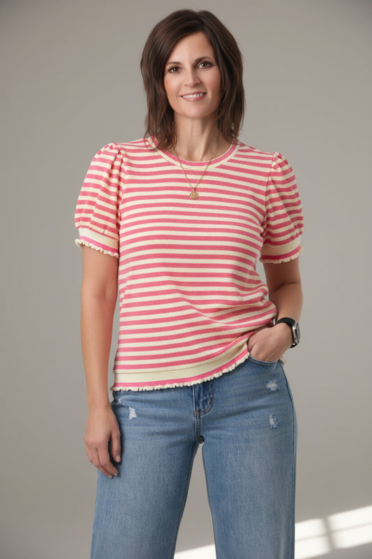 Striped Puff Half Sleeve Crew Neck
