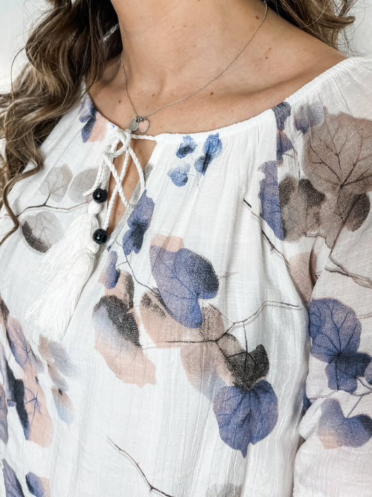 Leaf Printed Lace Insert Blouse