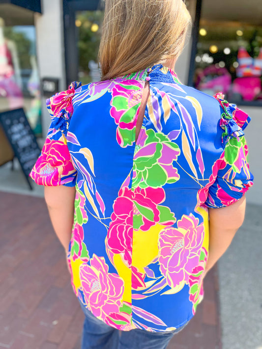 Royal Blue Flower Smocked Mockneck Blouse