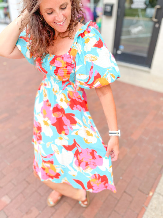 Aqua Floral Printed Puff Sleeve Mini Dress