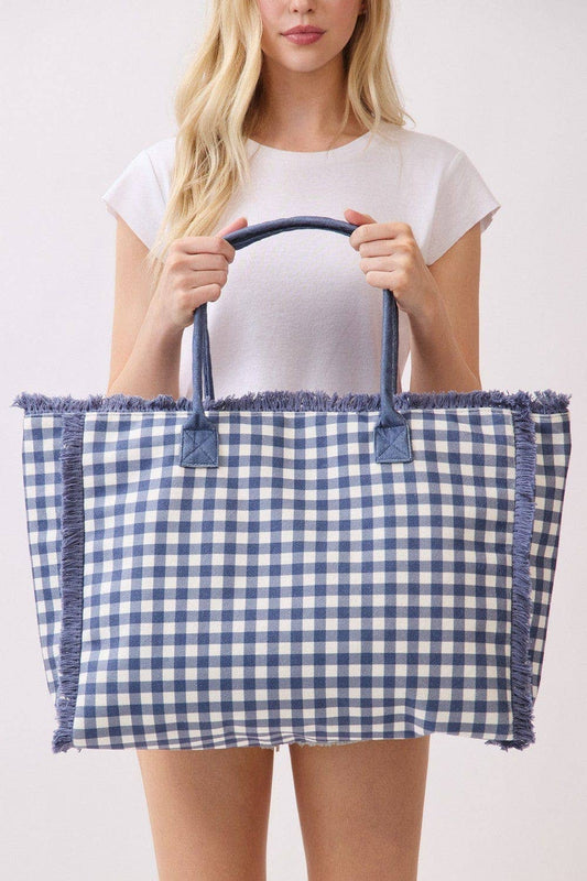 Gingham Terry Cloth Fringe Beach Tote Bag