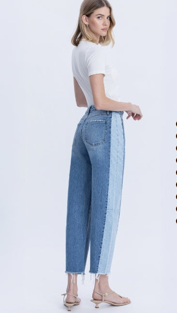 Step out in style with the "Blue Memoir" 2 Tone High Rise Barrel Jean. These jeans blend two shades of blue for a fun, eye-catching look while the high-rise fit flatters your waist. The barrel shape adds a funky twist to your everyday denim, perfect for expressing your playful vibe wherever you go.