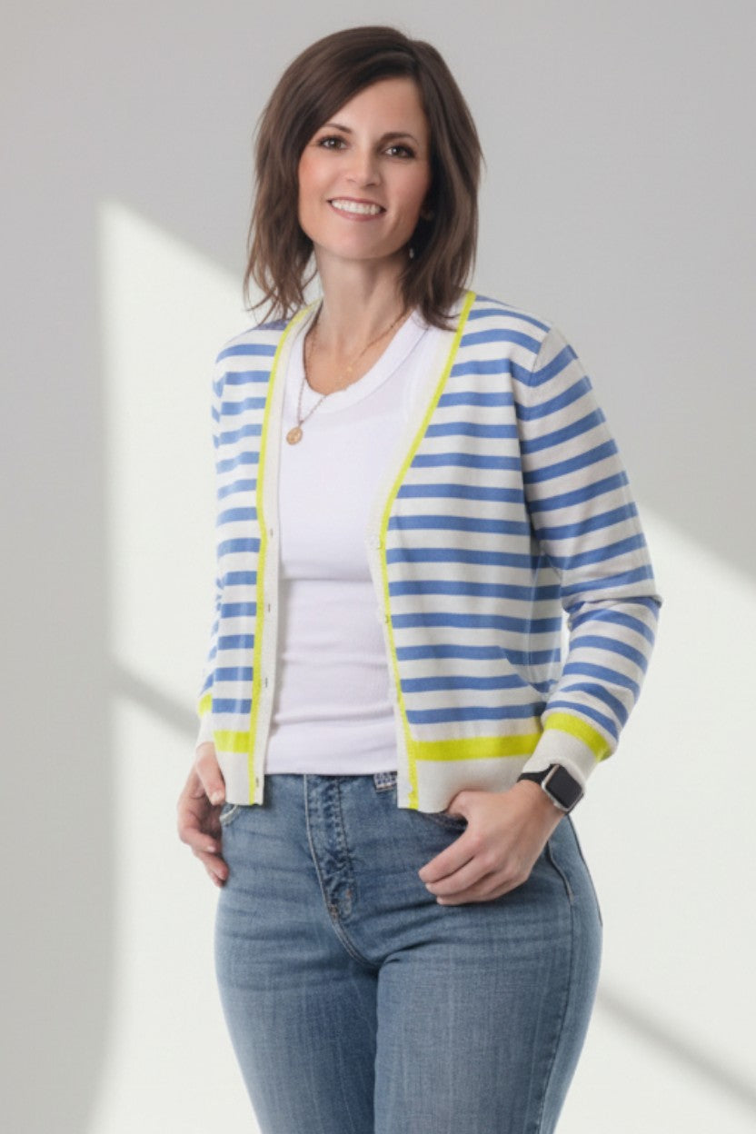 Layer up with personality in this vibrant striped button-down cardigan that brings instant joy to any outfit. Choose between bubblegum pink paired with apple green accents or sky blue with cheerful chick yellow accents—both combinations pop with color and charm. The classic button-down style keeps things versatile, while the bold stripes add that fun, eye-catching flair. Perfect for anyone who refuses to blend in and loves wearing their mood on their sleeve.