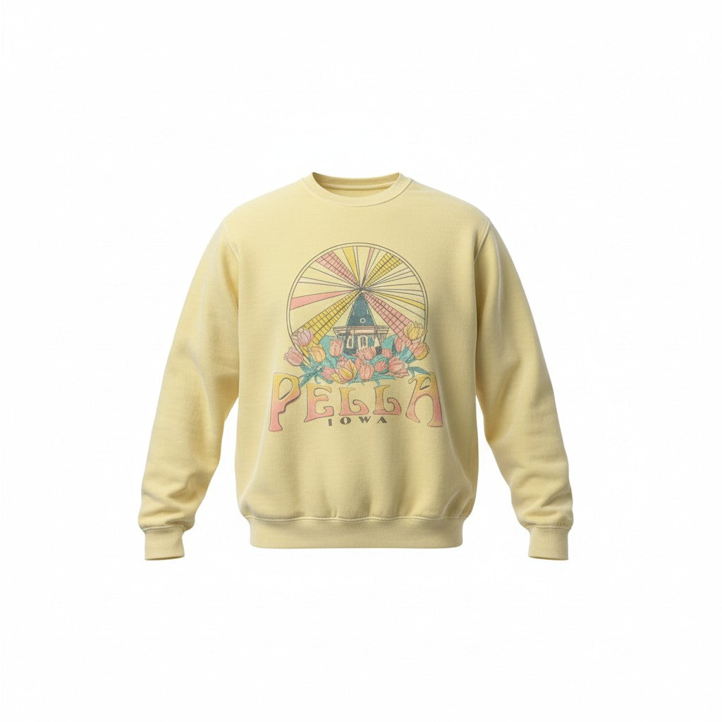 Celebrate spring in style with this butter yellow sweatshirt, perfect for Tulip Time enthusiasts and windmill lovers. Featuring a charming design inspired by Pella's iconic springtime scenery, this cozy piece brings vibrant color and cheerful spirit to your wardrobe. Whether you're attending the festival or simply embracing the season's joy, this playful sweatshirt is a delightful way to show your love for tulips, windmills, and all things spring.