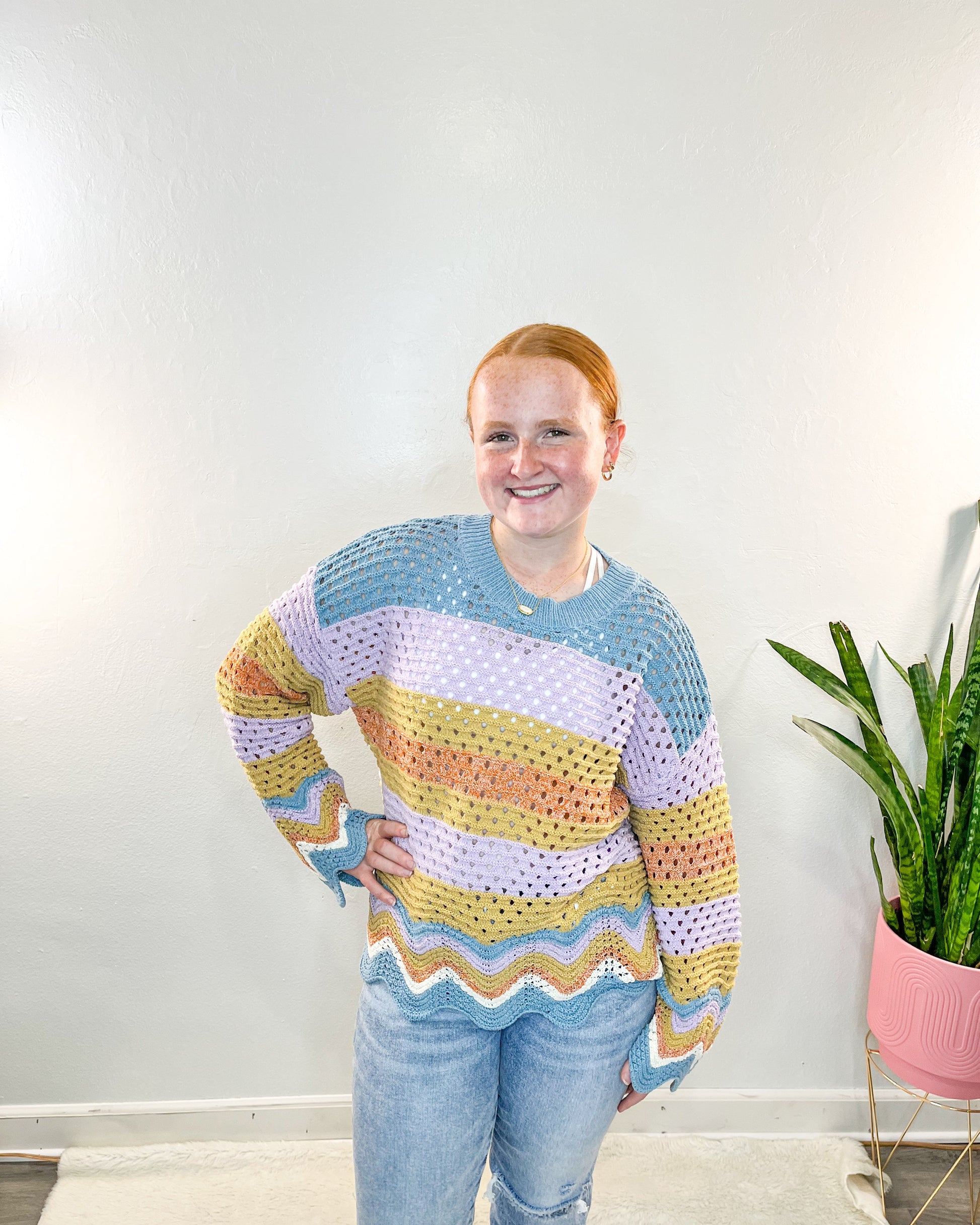 Brighten your wardrobe with the Colorful Wave Knit Scalloped Edge Sweater, featuring a playful mix of muted mustard yellow, dusty blue, rust, and lavender. Its loose crochet design and scalloped edges add a charming, breezy vibe perfect for layering. Pair it with wide-leg denim for an effortlessly cute and comfortable look that’s ready for any casual outing.