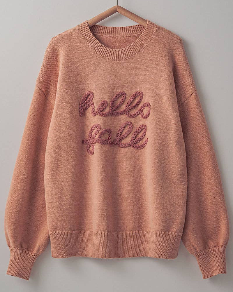 Cozy Embroidered Hello Fall Knit Crewneck Sweater