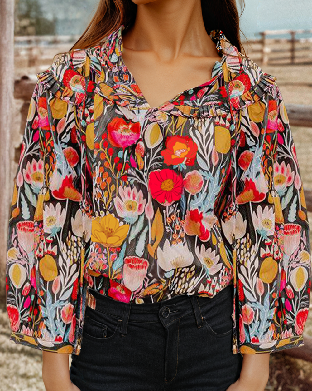 Floral 3/4 Puff Sleeve Tied Neck Blouse