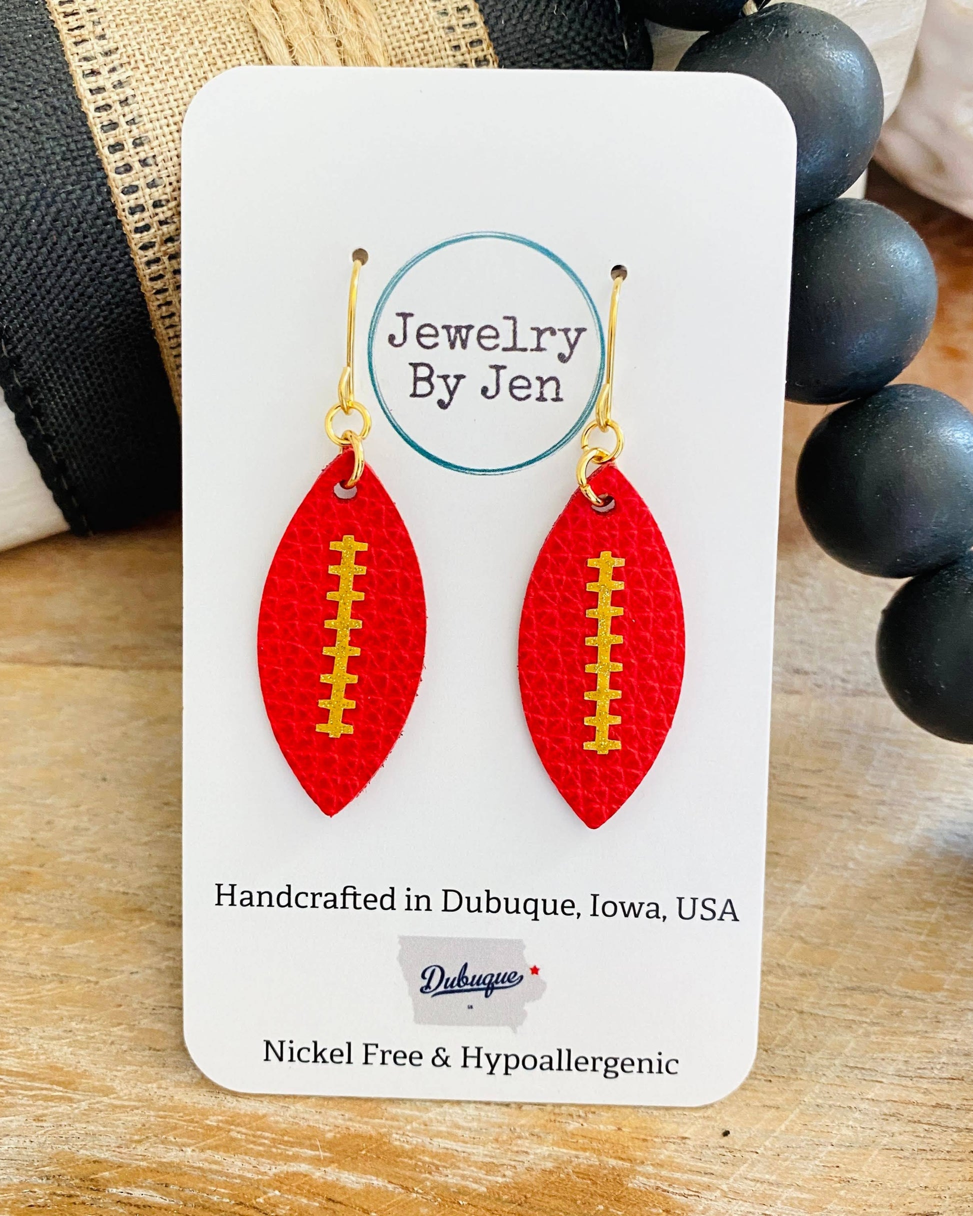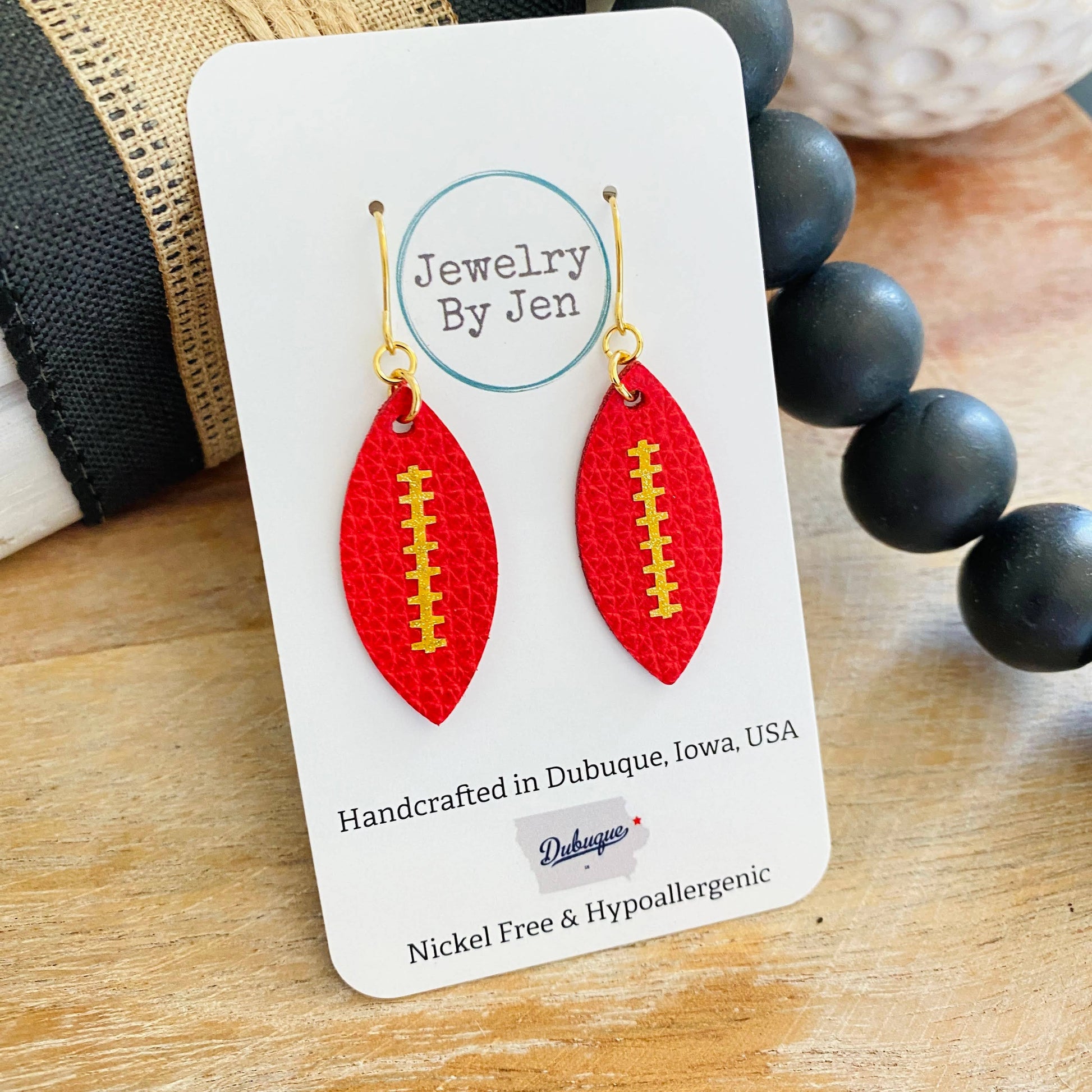 Show your team spirit with these playful Red w/Gold Stitches Football Earrings. Perfect for game day, they add a fun pop of color and school pride to any outfit. Pair them with our gold and Cardinal Red Game Day Hoodie for a coordinated look that scores big on style and enthusiasm.