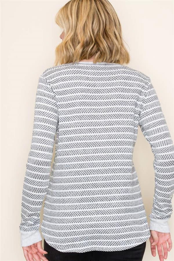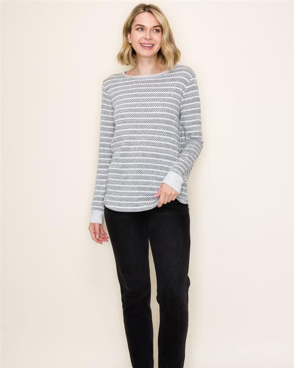 Stay cozy and stylish in this light grey pullover featuring a fun black and white hash mark texture print. Perfect for adding a playful twist to your casual look while keeping you comfy all day long.