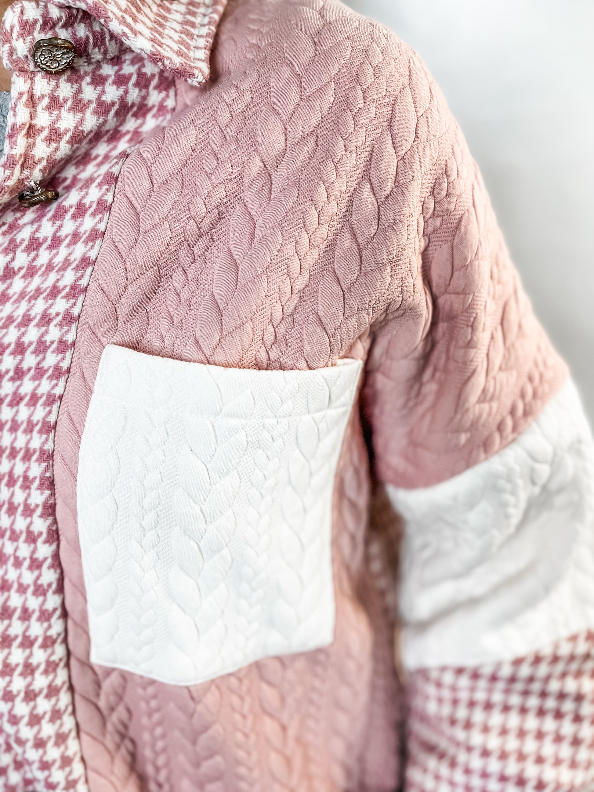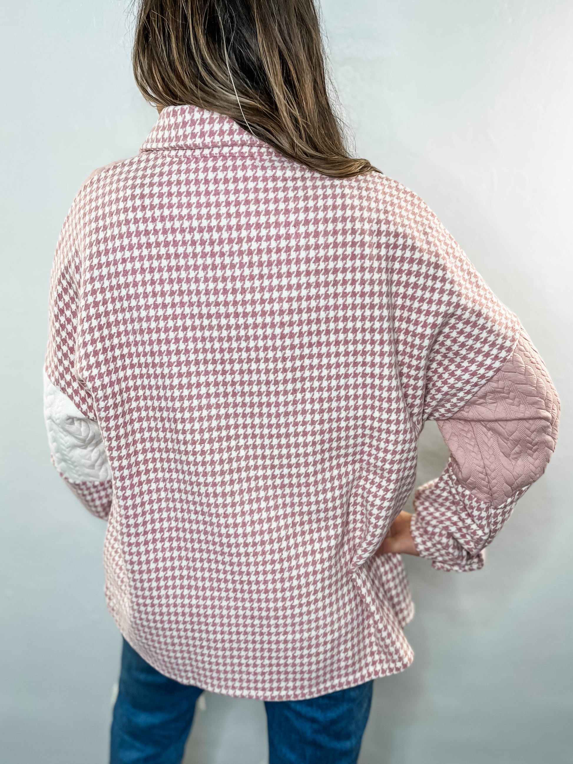 Make a statement in our Pink Houndstooth Patchwork Shacket! This playful blend of patterns brings bold, classic houndstooth together with a fresh pink twist, creating a chic, eye-catching look. Perfect for layering over anything, this shacket adds a cozy yet fashionable touch to your outfit. Whether you're out for a stroll or meeting friends, this unique piece will have you turning heads with every step!