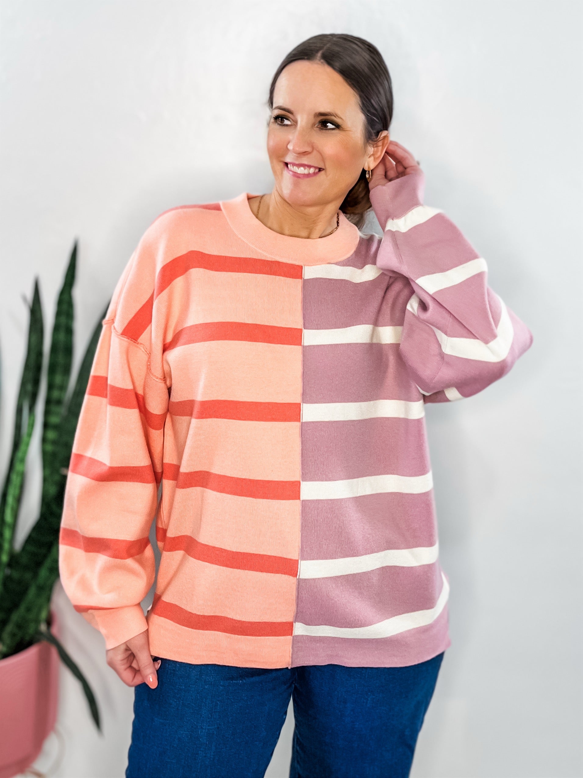 Grab this talked about Pink Lavender Half & Half Stripe Sweater. Made with high-quality fabric, you'll never want to take it off. Whether you're dressing it up or dressing it down, this versatile sweater is perfect for any occasion. So go ahead and add some style to your wardrobe, you deserve it!