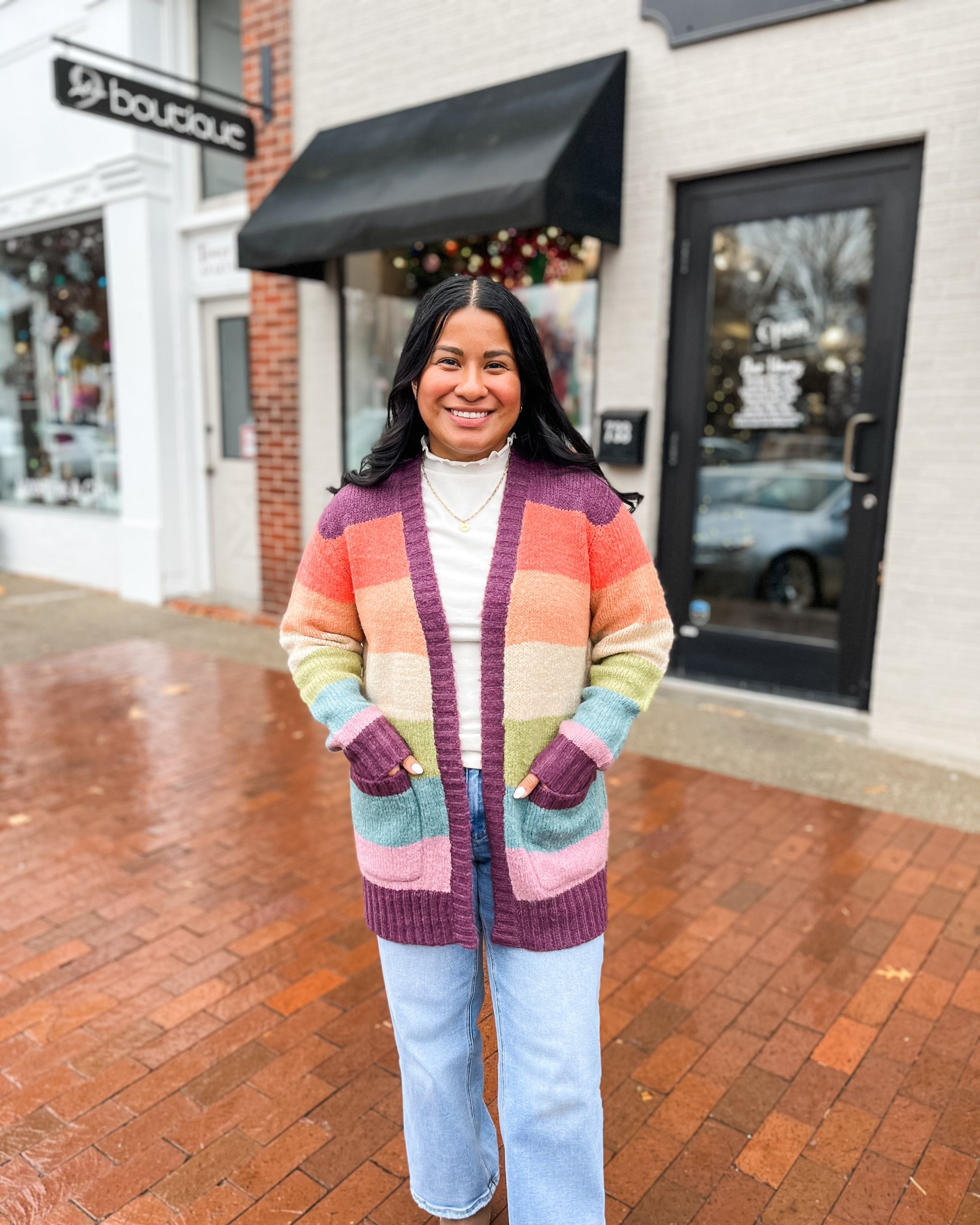 Layer up in style with this vibrant striped cardigan that brings the perfect pop of color to any outfit. Featuring rich plum tones paired with bright accent stripes, this piece effortlessly transitions from casual weekends to office-ready looks. The relaxed fit and soft fabric make it ideal for layering over tees, dresses, or sweaters. Whether you're reaching for comfort or making a fashion statement, this cardigan delivers both with its eye-catching palette and versatile design. A wardrobe essential that proves stripes are always in season.