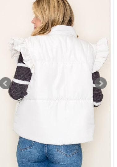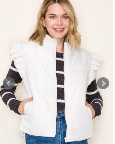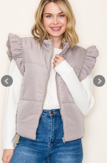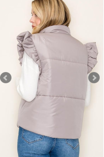 Add a playful twist to your layering game with the Ruffled Sleeve Puffer Vest. Available in soft Ivory and warm Taupe, this vest features charming ruffle details on the sleeves that bring a fun, whimsical touch to your look. Lightweight yet cozy, it’s perfect for adding warmth and style without bulk.
