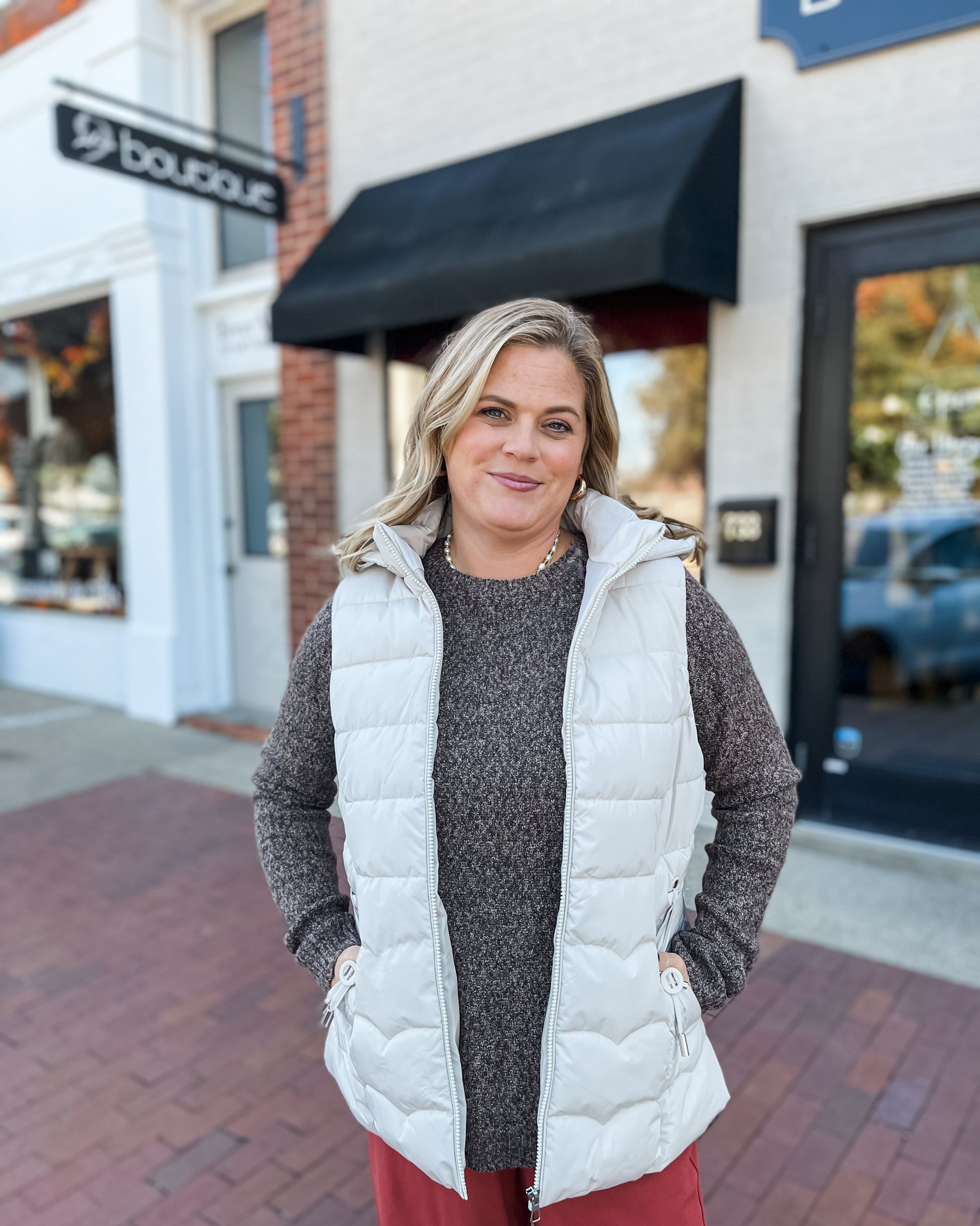 Stay cozy in style with this Short Hooded Puffer Beige Vest. Featuring playful button details on the pocket, it adds charm while keeping your essentials secure. Perfect for layering, this vest brings warmth and a pop of fun to your casual wardrobe.