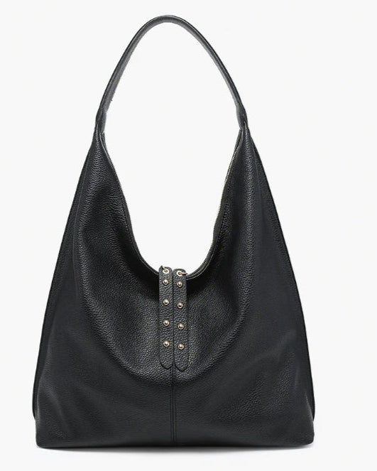 The Tori Slouchy Hobo is a stylish and spacious accessory crafted from premium vegan leather. Featuring double studded zipper pulls and a back zip pocket, this hobo combines a relaxed, slouchy design with functional details. Its ample size and distinctive accents make it a standout choice for both casual and chic occasions.