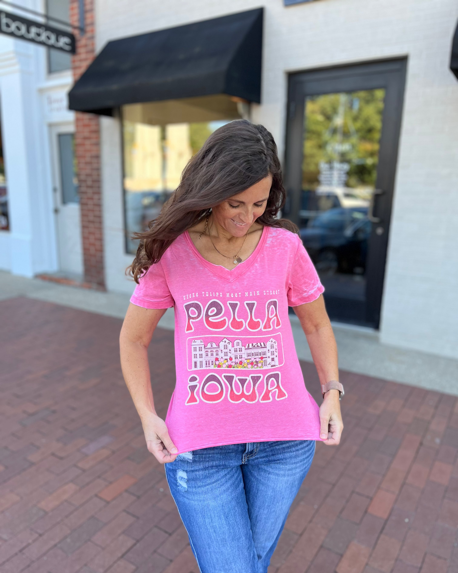 Celebrate the charm of Pella with the Tulips Meet Mainstreet Pella T-Shirt. Featuring a playful raw hemline and comfortable v-neck, this tee blends casual style with a touch of hometown pride. Perfect for strolls down Mainstreet or brightening up your everyday look with a nod to blooming tulips.